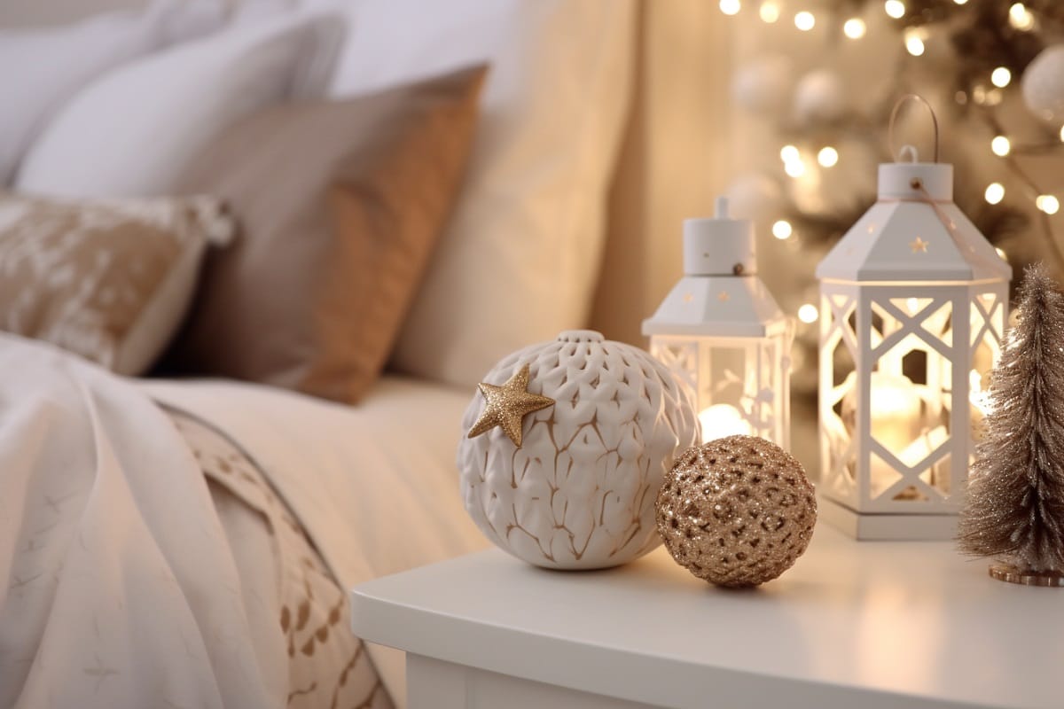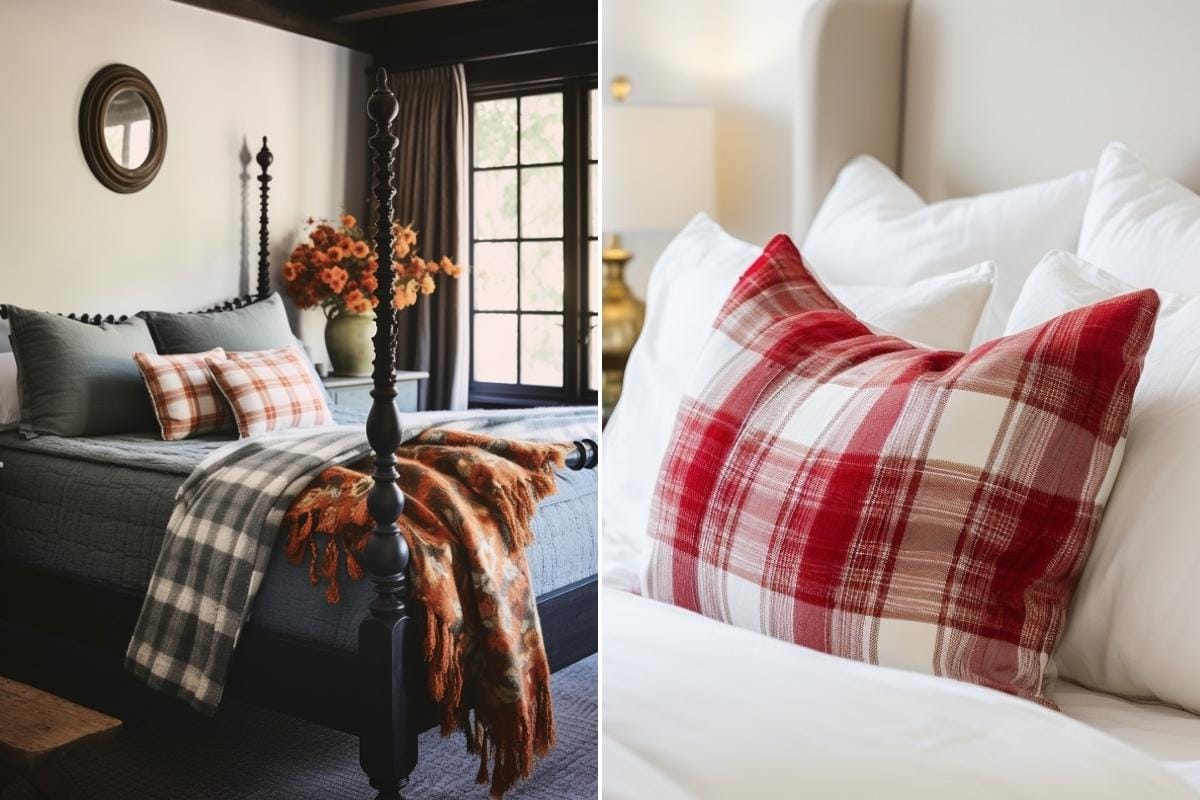 Ekose desenli yastıklar, atılan örtüler ve yumuşak dokular; yatak odasında anında yılbaşı etkisi sağlar.