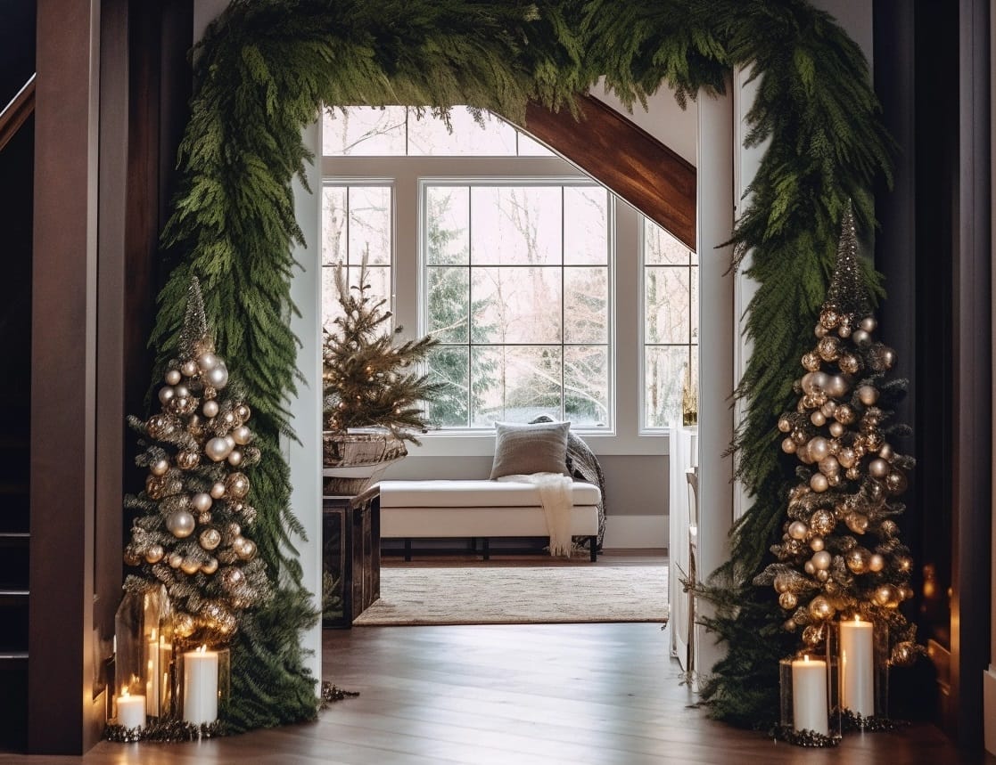 Kapı çerçevesi boyunca inen doğal garlandlar; hem misafirleri karşılar hem de holü kusursuz bir yılbaşı tüneline dönüştürür.