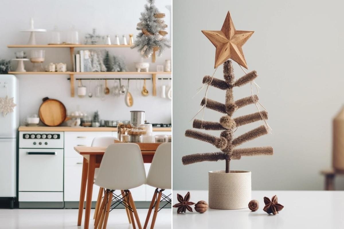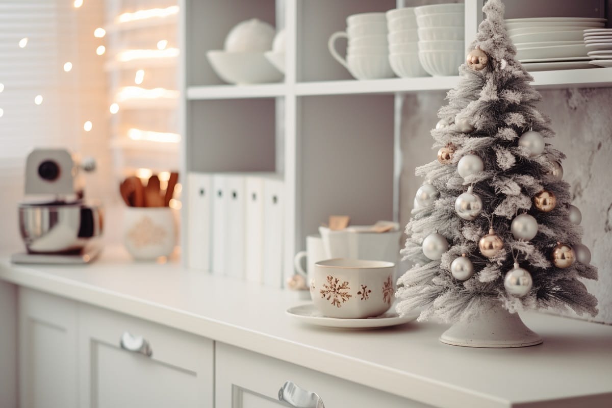 Açık raflarda yer alan mini süslemeler, cam kavanozlarda ışıklar, ahşap servis ürünleri ve sade bir renk paleti, mutfağı doğal bir yılbaşı sahnesine dönüştürür.