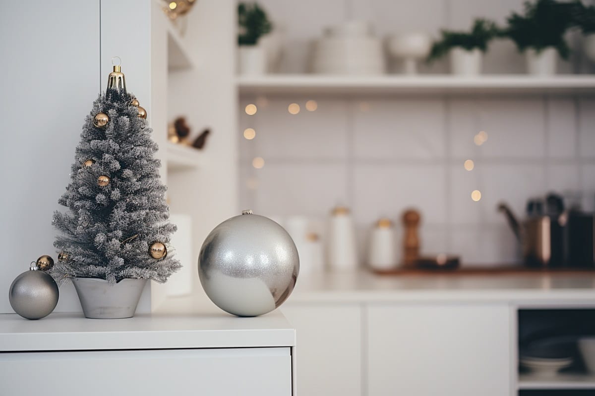 Altın ve gümüş tonlarındaki küçük objeler, mutfakta abartıya kaçmadan şık bir yılbaşı etkisi yaratır.